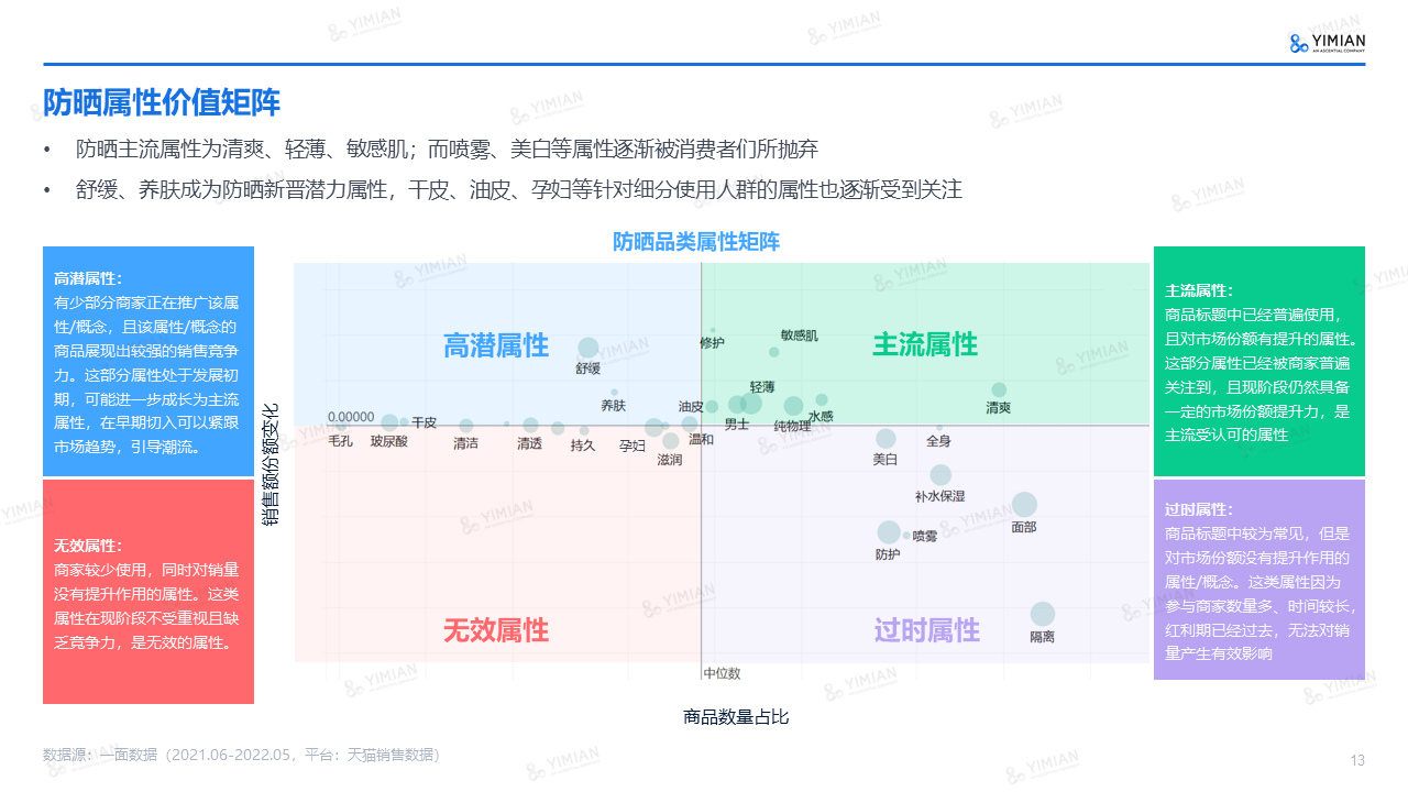 从产品属性来看,我们把电商上所有的商品标题进行了分析总结,做出了防晒品类的属性矩阵,分为主流属性、高潜属性、无效属性、过时属性。