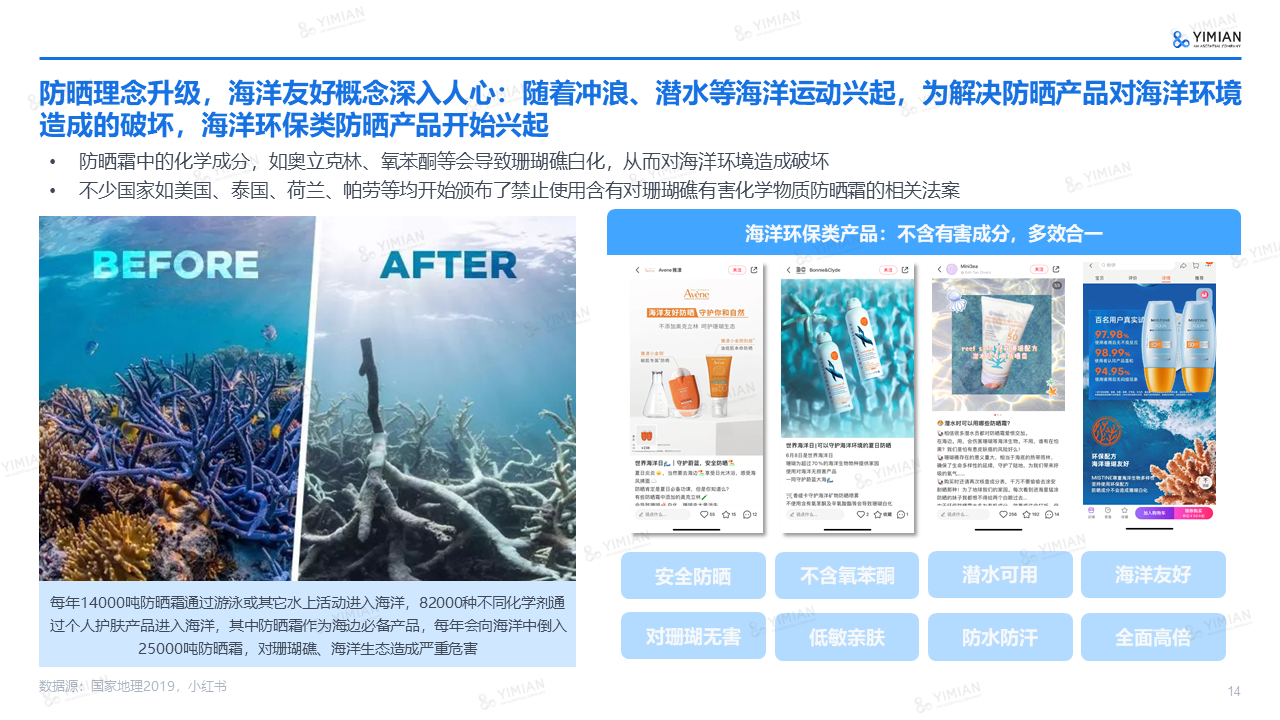 三是海洋友好。人们对成分的认知越来越深入,在水上运动时会倾向选择对海洋环境友好的防晒产品,从而促使防晒产品研发时贴合这类使用场景。