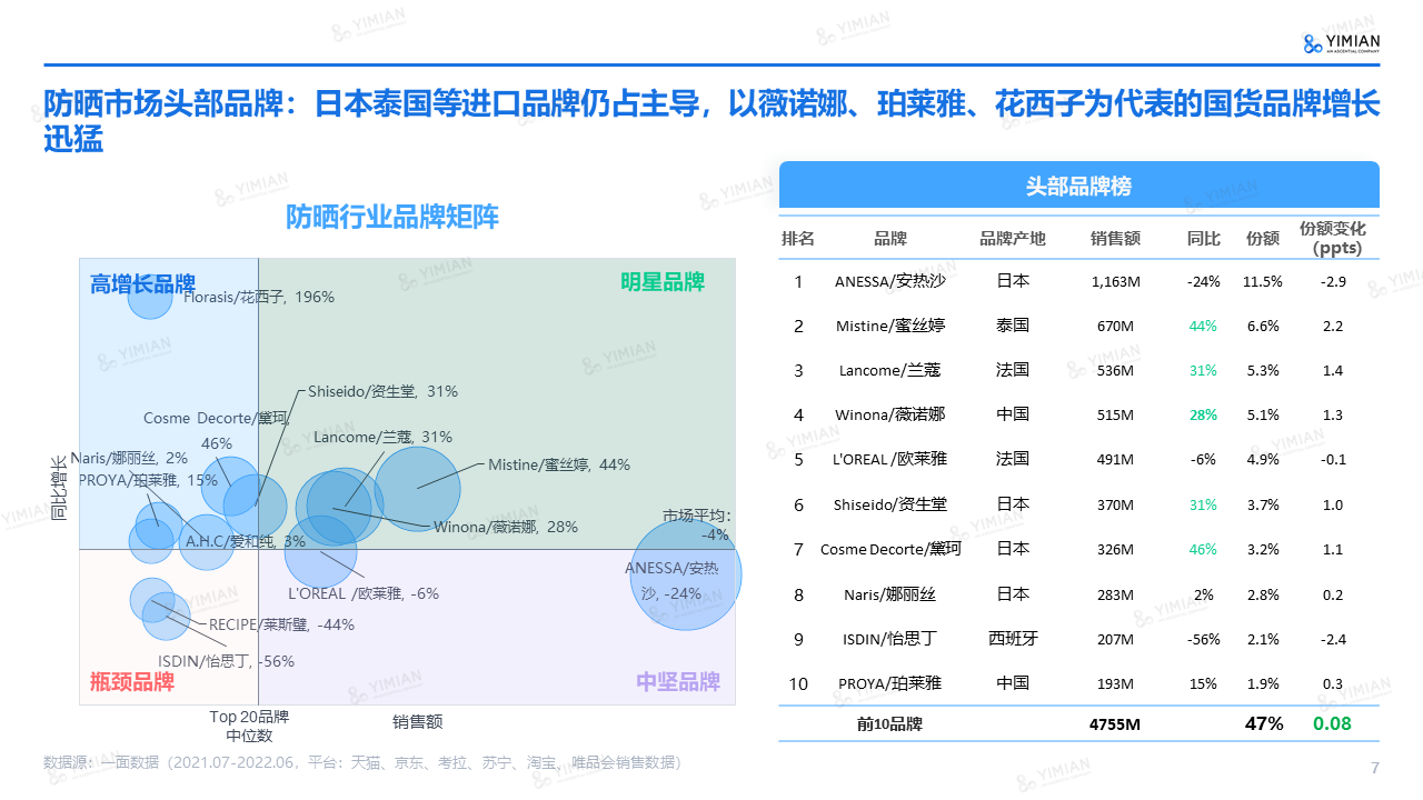 头部品牌整体表现还是不错的,前10品牌占了47%的市场份额,同比去年份额变化仅有0.08个百分点,相对来说较为集中稳定,但品牌同比变化却大相径庭。从整体大环境来看,位居TOP1的安热沙同比下降了24%,但第二名的蜜丝婷却逆势增长44%,可见疫情与防晒品牌涨跌并无直接关系;从大众兴趣来看,如今户外旅游及水上运动发展较快,主打户外和海上运动的安热沙也不应有如此大的下跌。