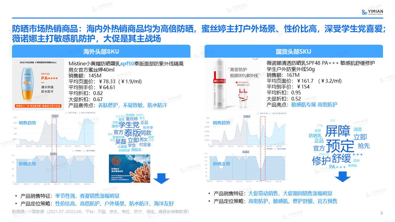 在防晒市场热销商品中,我们分别选择了海外头部品牌蜜丝婷及国货头部品牌薇诺娜进行对比。