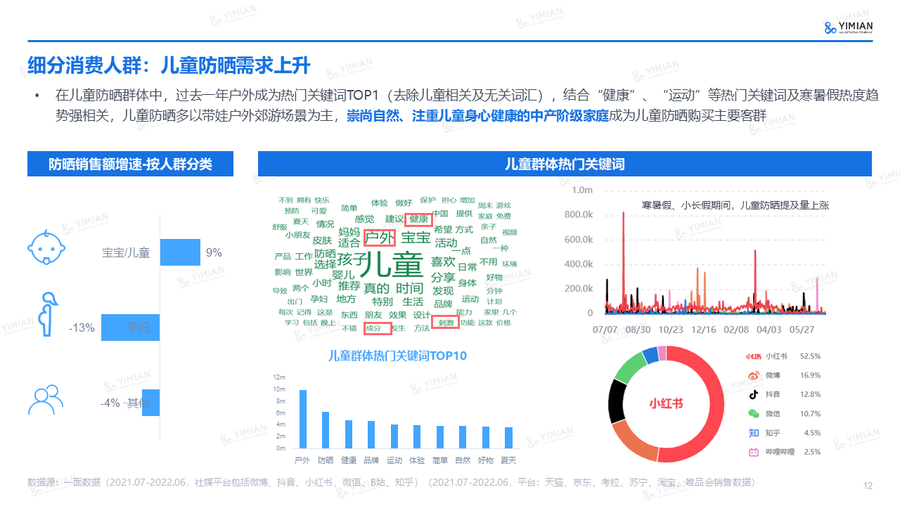 从细分人群来看,我们通过电商的销售数据发现,宝宝/儿童防晒霜同比增长了9%,相比护肤大盘来说表现很好。从社交媒体来看,消费者对于儿童防晒的使用场景和诉求非常明确,与儿童防晒相关的内容,热度走势与放假时间是非常吻合的。在小朋友放寒暑假或是小长假时,家长会带着小朋友进行户外活动,接触大自然,由此产生对防晒霜的需求,成分安全不刺激的儿童防晒成为了家长们的首选,所以品牌的知名度也是家长是否购买的重要考虑因素。