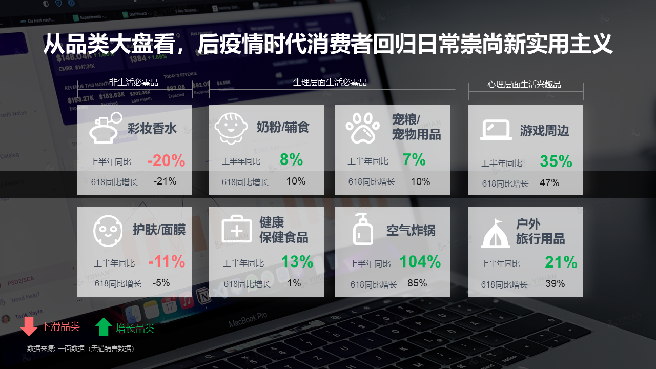 后疫情时期,消费者回归日常,更加崇尚新实用主义。从品类大盘看,非生活必需品,如彩妆、香水、护肤,受影响比较严重,其中护肤上半年同比下降了11%。与此同时,生理层面的必需品,如健康保健品、婴幼儿以及宠物用品相关的品类保持坚挺。