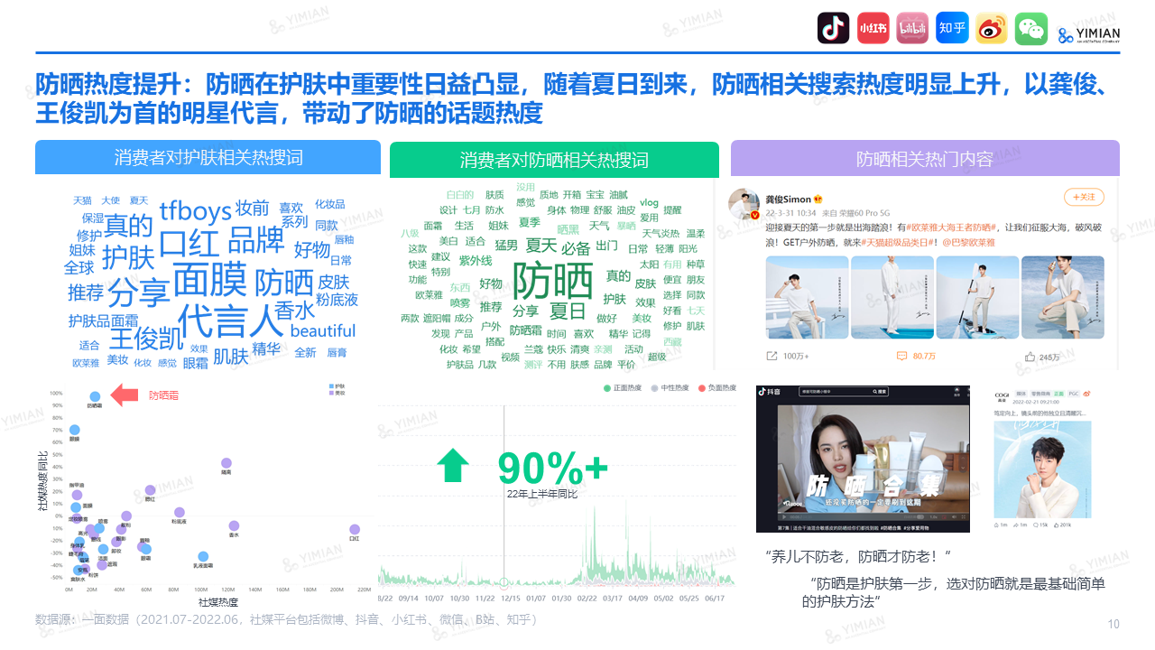 上半年大多数护肤相关的社媒热度是下跌的,而防晒霜的相关帖文的热度同比增长超过90%,其中较多热度是由品牌代言所驱动的。此外,还有一些声量来自护肤达人KOL,他们大量宣传防晒在护肤中的重要性,如“养儿不防老,防晒才防老”、“防晒是护肤的第一步”,潜移默化地强化消费者的防晒意识。