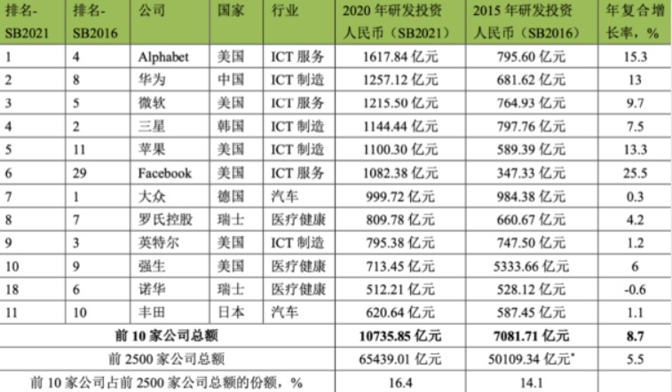 2021年与2016年研发投资前10公司对比,图源欧盟委员会联合研究中心(JCR)