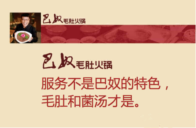 譬如“巴奴”,其广告语的一句“服务不是我们的特色,毛肚和菌汤才是”,此广告语成为了餐饮业里的经典广告语,它以富有个性的口吻瞬间提升了自身品牌的知名度和影响力。