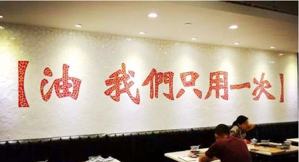 ▲“禄鼎记”打出了“油,我们只用一次”的口号,代表了“禄鼎记”与传统川菜的区别,展现其菜式干净清亮的特性。