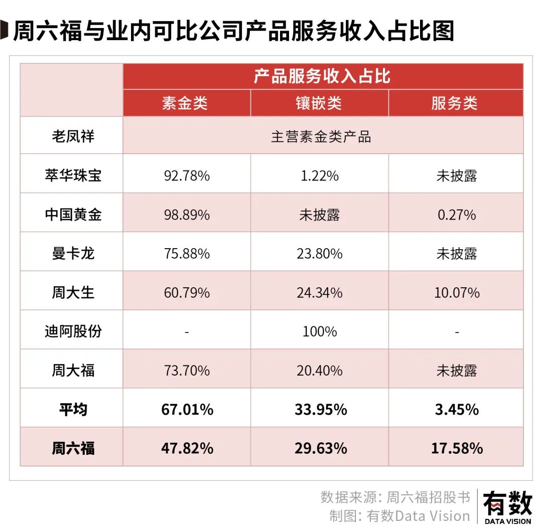 原因主要出在收入结构上:周六福拥有可比对手中最高的服务费占比和仅次于迪阿股份的镶嵌类占比。