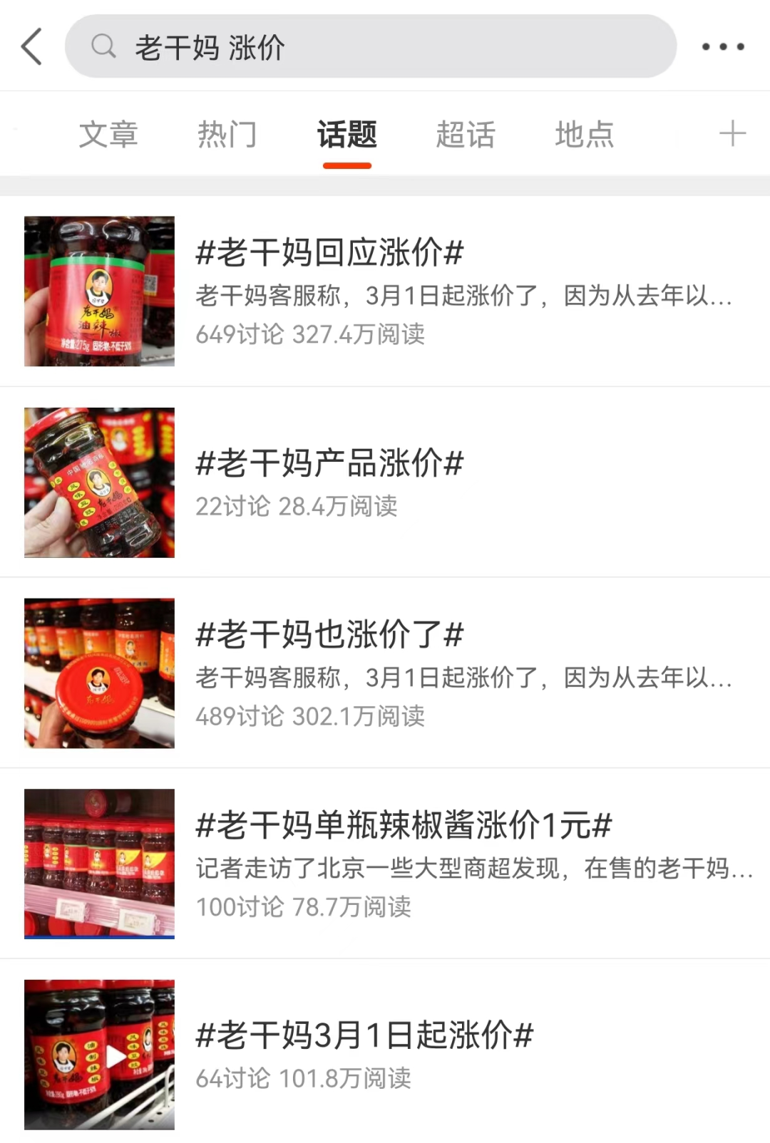 老干妈涨价引发多个微博讨论话题;图片来源:微博