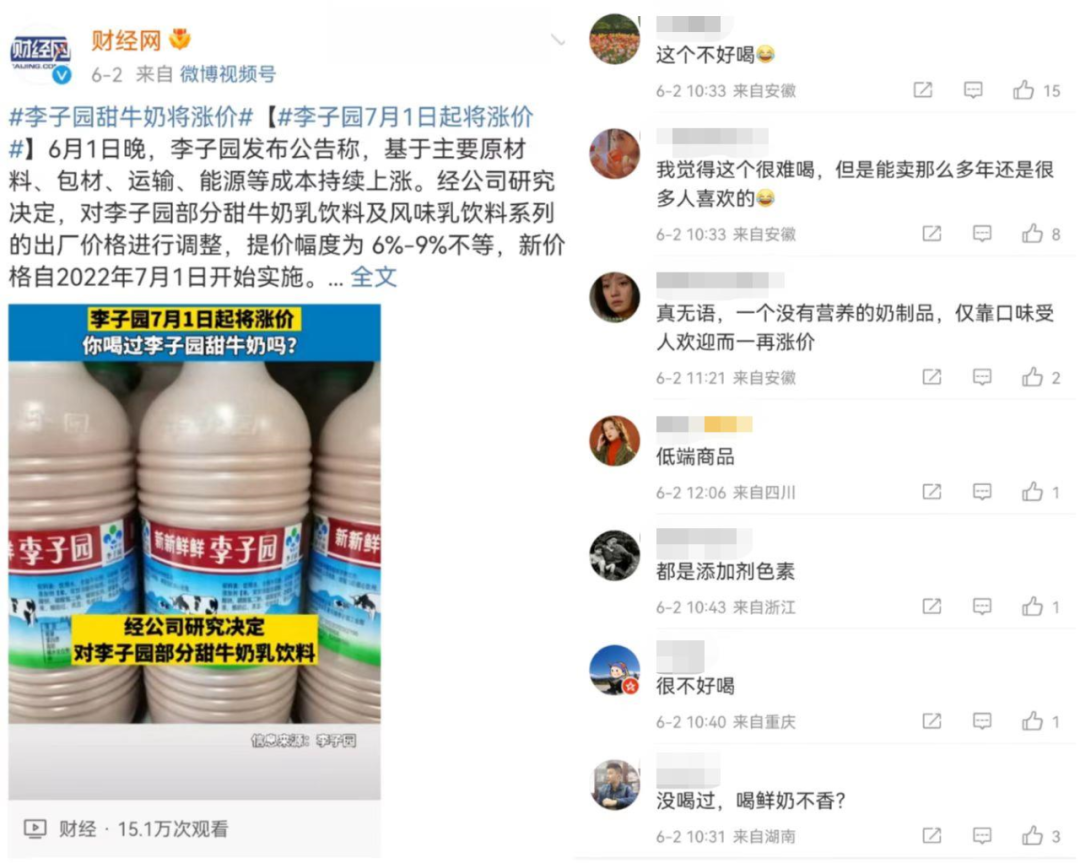 李子园甜牛奶涨价的新闻评论里,有消费者质疑其“含乳饮料”的成本问题,“又不是牛奶,营养成分不高,为什么还要涨价?”