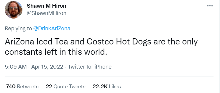 近期,一条推特就在网络引起热议:Costco热狗和AriZona冰茶是这个世界上仅存的两个“常数”。言下之意是,多年来各类商品物价飞涨,只有它俩的价格始终没变。
