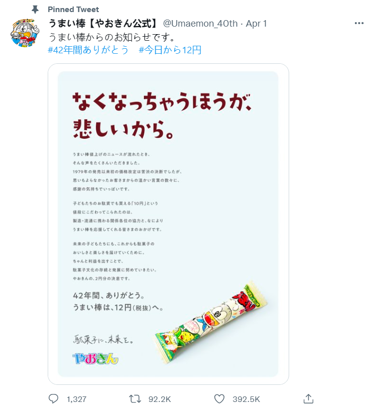 Umaibo涨价信;图片来源:Twitter@Umaemon_40th