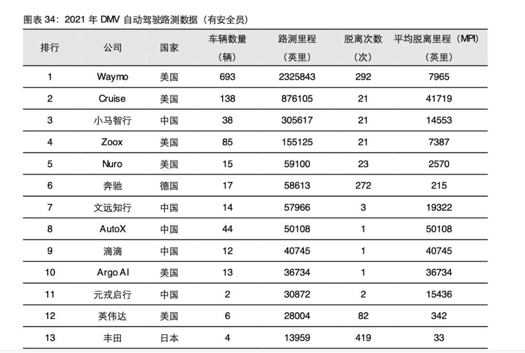 根据DMV(美国加州交通管理局)发布的2021年数据,中国AutoXMPI为50108英里排名第一,美国Cruise MPI为41179英里排名第二,中国滴滴MPI为40744英里排名第三。