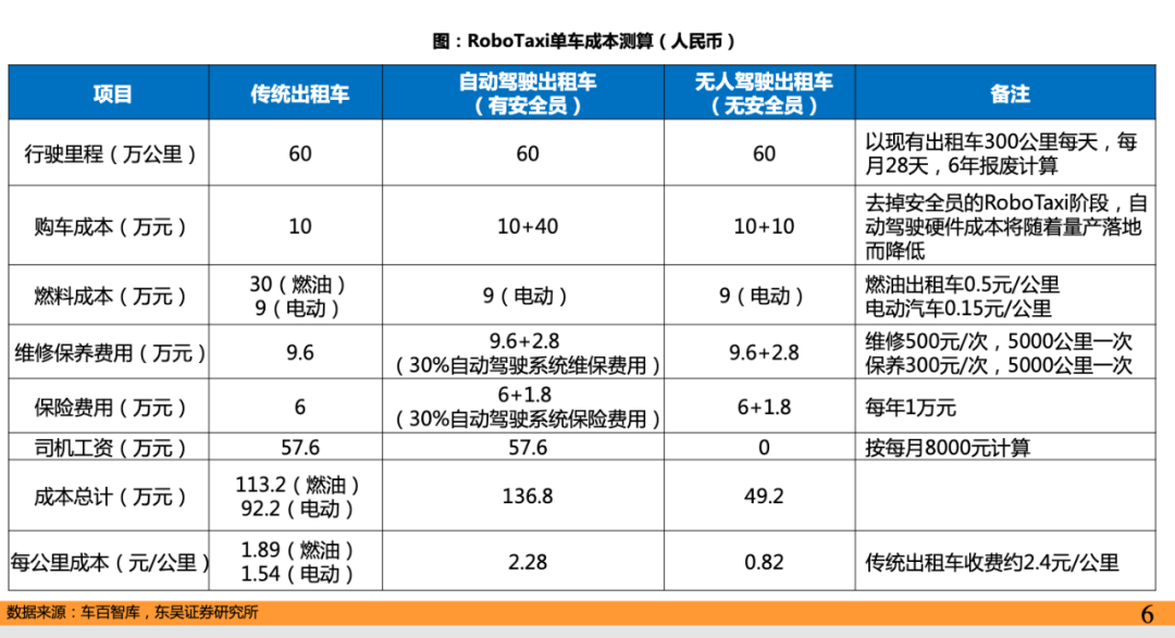 通过拆解Robotaxi的单车成本构成可以看到,传统出租车每公里成本为1.89元,有安全员的自动驾驶出租车每公里成本2.28元,无安全员的自动驾驶出租车每公里成本0.82元。