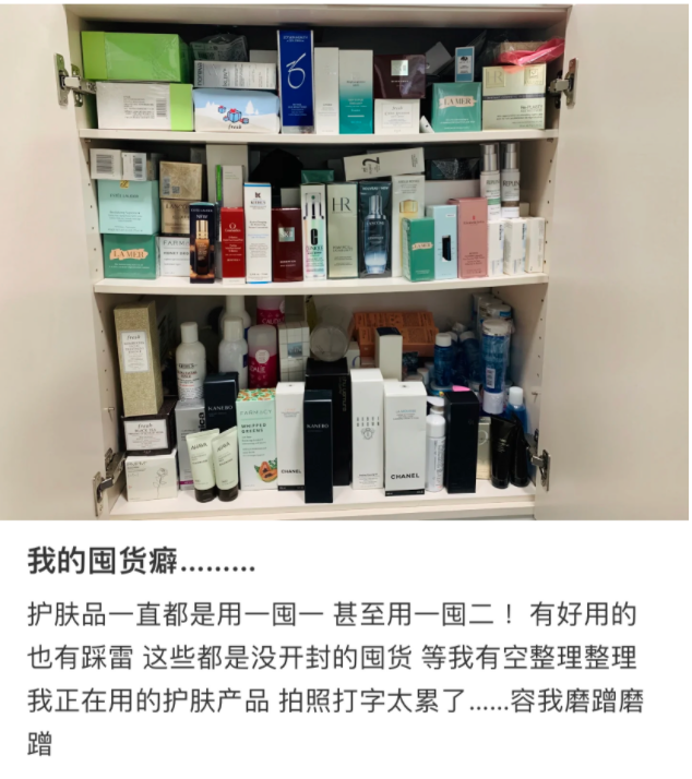 有用户囤积的大牌护肤品已经将柜子压弯