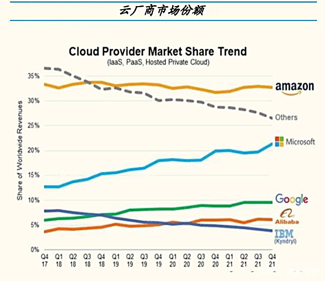 云服务市场一直以来都是马太效应明显,全球公有云市场主要被五大厂商控制,呈现出强者愈强的格局。