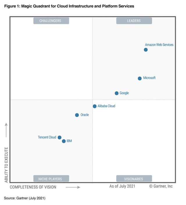 根据Gartner发布的只统计了全球市场的2020云基础设施和平台服务魔力象限,阿里云只处在“利基市场”的象限,是指公司发展前景的完备性和执行能力方面都得低分的公司。而在2021年则进入“远见者”象限,是在前瞻性上有所突出的公司。侧面表明国内云计算厂商难以在海外扩大市场份额。