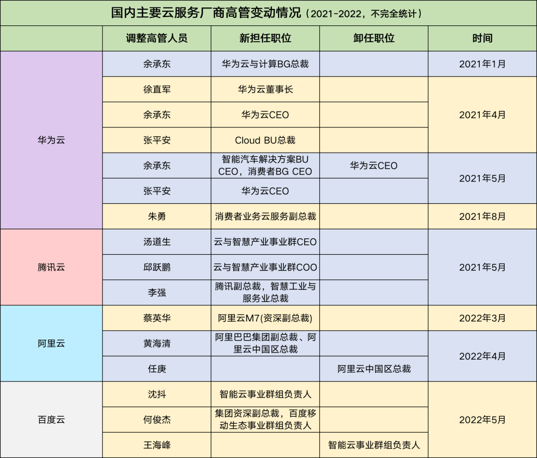近两年来,国内主流云服务大厂阿里云、华为云、腾讯云和百度云几乎都经历了一轮甚至多轮的组织架构与高管变动。