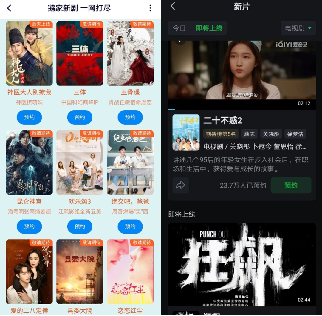 而在待播内容中,腾讯视频、爱奇艺也是各自手握重磅内容。在各自“敬请期待/即将上线”的片库中,腾讯视频的《玉骨遥》、“鬼吹灯”系列的《昆仑神宫》、《欢乐颂3》;爱奇艺的《二十不惑2》《狂飙》《第二次拥抱》等都是颇受市场期待的内容,一旦在后来的内容布局中“闯入”暑期档,也有望掀起新的讨论热潮。
