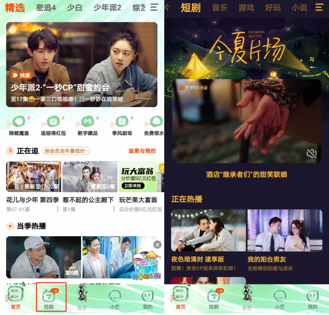 暑期档内,除了优酷继续着力布局短剧之外,芒果TV也在《念念无明》出圈后加码短剧市场,平台不仅在站内底部设置短剧入口,旗下大芒短剧也打造了首个时令片场——今夏片场,《我的超能力没有存在感》《朝九晚五的热恋》《从前慢》等短剧正于暑期档悉数上线。