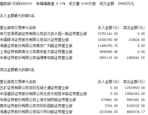 盘后龙虎榜显示,今日买入嘉凯城的前五席位也均是游资席位。申万宏源西部证券武汉武大园一路、中国银河证券绍兴证券、海通证券南京广州路、上海证券南京胜太路、中泰证券淄博青年路分别居前五席位,合计买入9926.18万元。