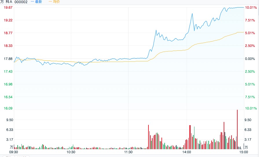 消息一出立刻引爆投资者情绪。下午13点20分左右,万科A(000002.SZ)开始疯狂拉升,股价从17.90元/股左右飙升至19.43元/股,涨幅超过8%。与此同时,港股万科企业(02202.HK)也发生异动,涨近2%。