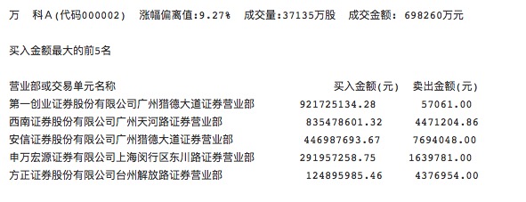 盘后龙虎榜表明,恒大总部附近几大券商广州营业部席位购买了约22亿元的万科A,超过当天全部成交额的30%。