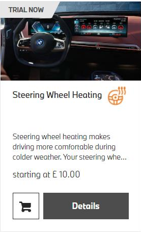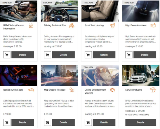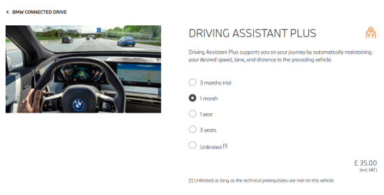 以宝马英国Connective Drive为例,座椅加热功能标价为15英镑每月,方向盘加热则为10英镑每月,分别约合人民币123元与82元。当然,用户也可分别花350英镑(2865元)和200英镑(1637元)买断。