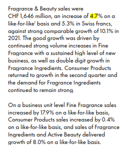 此外,香水和美容产品的销售额为16.46亿瑞士法郎(约合人民币115.2亿元),同比增长4.7%。就增长幅度而言,仍不及2021年同期的10.1%。但香精香料销售实现两位数增长,其中高级香水销售同比增长17.9%,日化香料与活性美容业务销售同比增长8.0%。食用香精香料与健康原料业务销售额为20.06亿瑞士法郎(约合人民币140.40亿元),同比增长7.6%。
