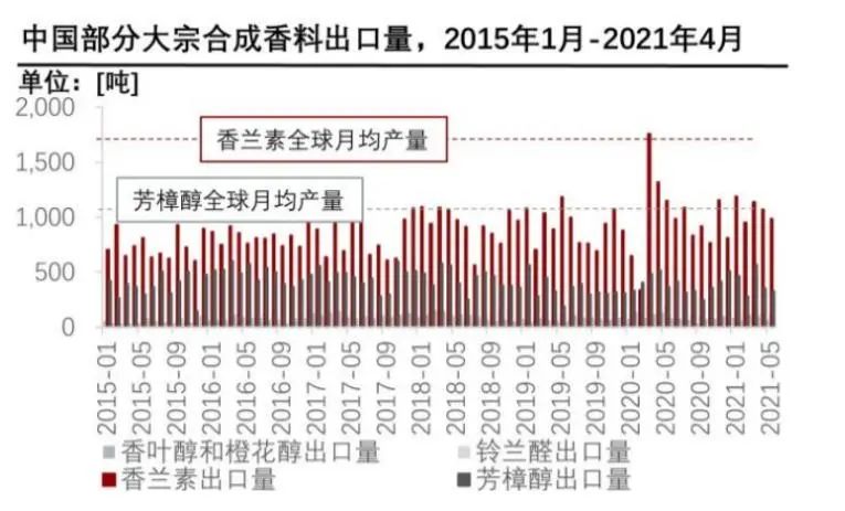 尽管中国香精香料企业在过去已经取得了长足的进步, 数据显示2015年到2021年间,我国出口香精香料不断增加,部分合成香料出口量甚至与月均产量持平。但出口产品集中在香兰素、香豆素、芳樟醇等中低端的大宗合成香料。部分高端香料产品,因产品批量小,附加价值高,国内企业尚无法进行生产。