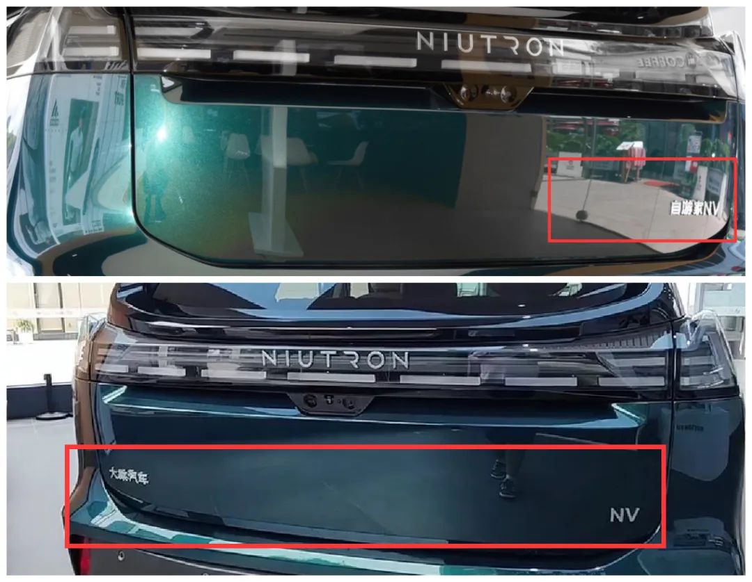 在自游家今年1月份发布的外观官图中,车尾有“自游家NV”这一车型名称与“NIUTRON”这一品牌标识。但北京的自游家直营店内,车尾已经不见“自游家”这三个字,除了“NIUTRON”标识外,只有左侧的“大乘汽车”与右侧的“NV”。除此之外,各地直营店里,展车的车尾部分也不尽相同,有些直营店的新车车尾就有“大乘汽车”的标识,有些则是“自游家NV”。