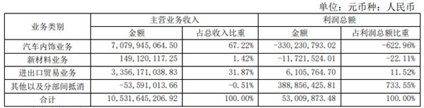 2021年年报显示,申达股份全年营业收入105.50亿、扣非后归母净利润亏损3.07亿元。其中,汽车内饰业务收入占申达股份主营收入的一半以上,但在利润总额方面却严重“拖后腿”,是几类主营业务中亏损最多的。