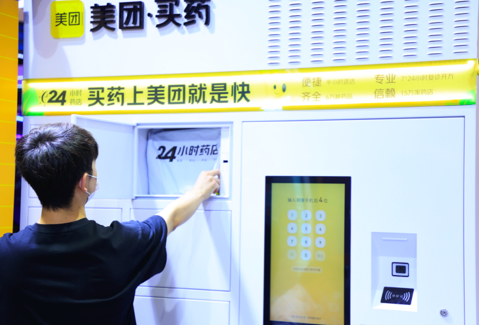 其中,24小时智慧药房通过视觉识别、自动化控制等技术,以科技的方式帮助商家解决24小时药店经营问题,助力应对消费者夜间用药不便的难题。在活动现场的24小时智慧药房展区,消费者可以体验到从下单到取货的全流程,“只需要在美团App线上下单后,智慧药房内的自动分拣设备即可根据订单在货架前快速取货,通过机械臂将订单药品运送至打包模块完成自动打包和小票打印并放入自助交接柜中,输入取货码即可取到商品。”现场的工作人员告诉记者。