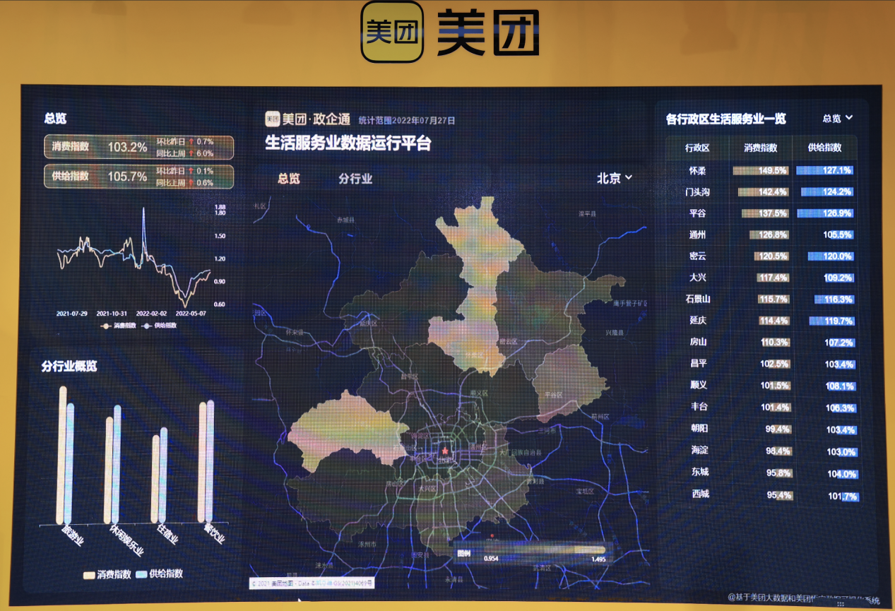 此外,在本次2022全球数字经济大会现场,美团还首次对外展示了生活服务总览大数据系统。该系统基于美团在生活服务领域的消费数据和实践积累,通过观测餐饮、娱乐等城市消费情况,将数据进行可视化,从而可以看到该查询城市的生活服务总览,以协助政府或相关部门实时了解生活服务业线上消费与供给的变化情况。
