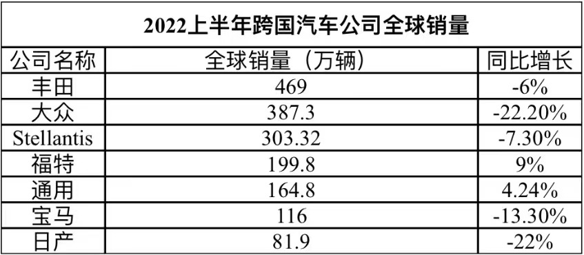 进入7月下旬,各大跨国汽车公司上半年销量纷纷出炉。在全球芯片持续短缺,经济环境下行,供应链紧张的大环境下,多家汽车制造商正面临产能下降,成本激增等一系列问题。在此影响下,传统汽车制造豪强上半年市场表现发生了较大变动。