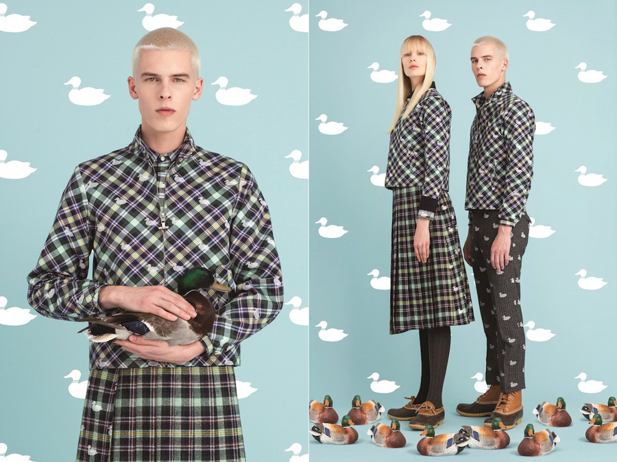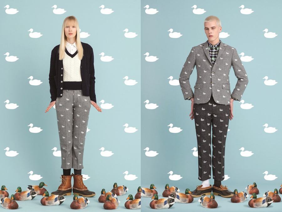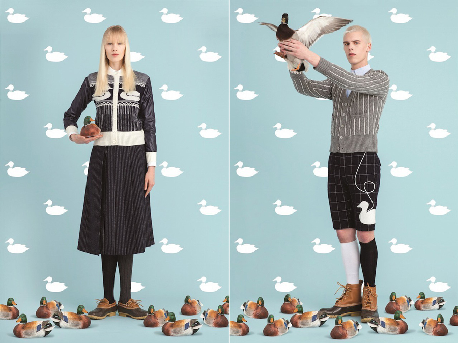出自Thom Browne之手的优雅都市形象从来都不是无趣的,这位美国时装设计师在2017春夏系列发布会上已经玩过了“热带鸟人”的狂欢派对,在这次和日本时尚品牌KOE合作的系列中,继续取材动物世界,以鸭子为主题,设计了从头到脚都玩味十足的套装。单品从人民币400到1700元不等,8月9日在KOE网店开售。