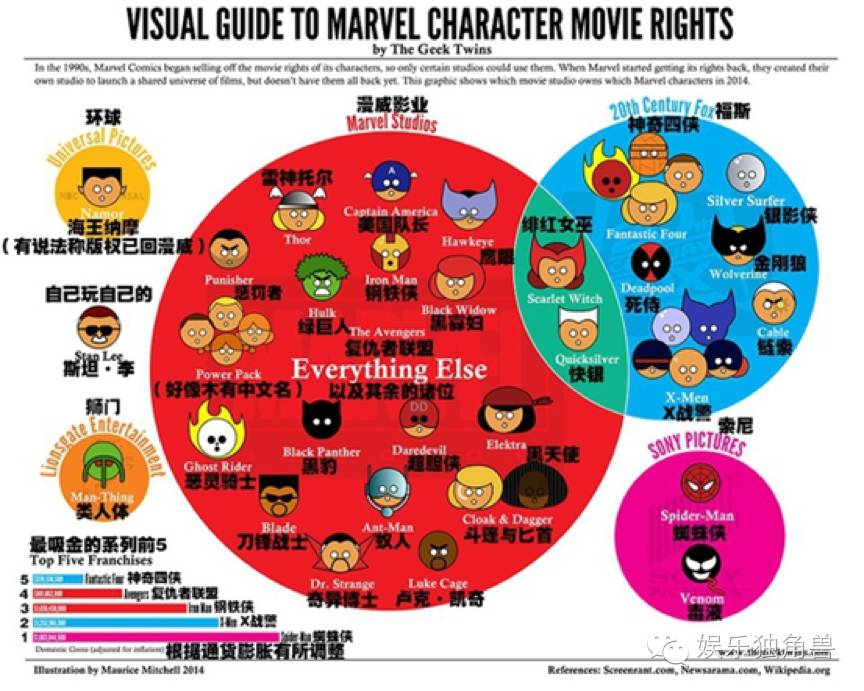 从这个图里,可以清晰地看到如今强大的漫威手中的漫画英雄的版权情况其实非常糟糕。《蜘蛛侠》归了索尼、《X战警》在福克斯手里,《死侍》也是福克斯而非漫威的。