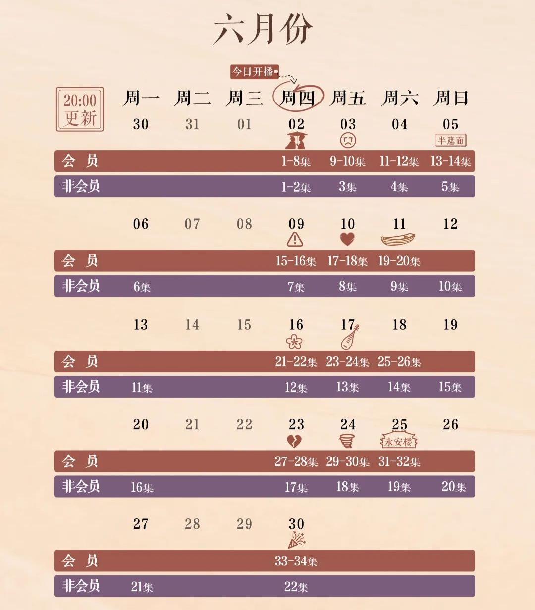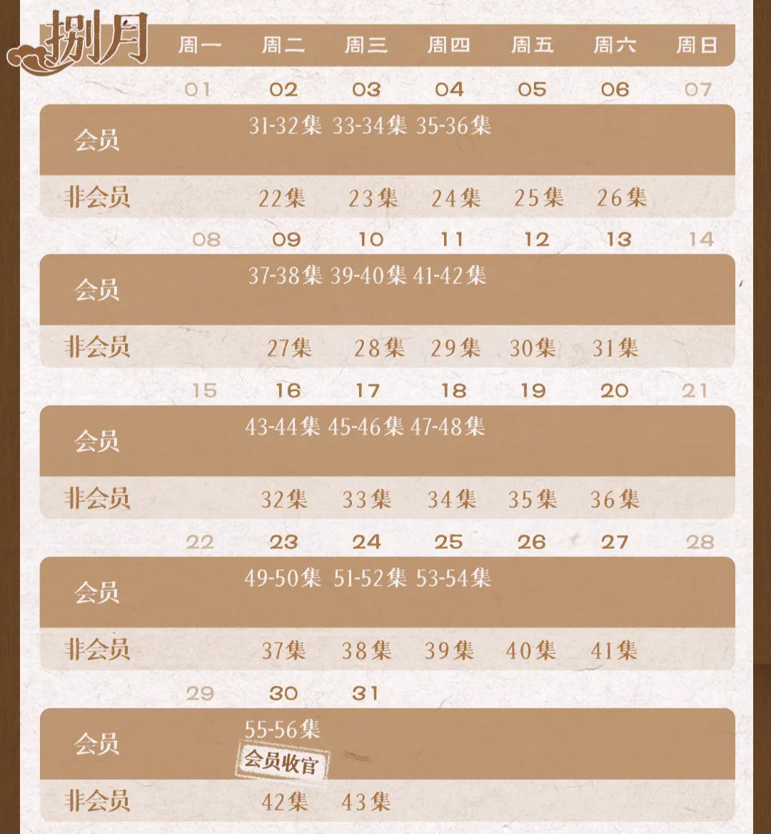 追剧日历,在定档或开播当天上线,有的还加标注关键的剧情节点、大结局时间等重点要素,以图片形式给到观众以提醒。
