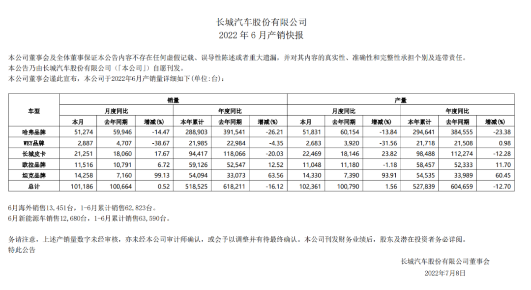 长城汽车2022年6月及上半年产销快报,图源长城汽车公告