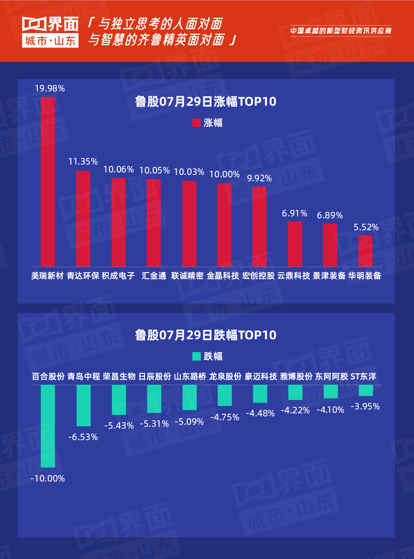 7月29日,山东省内沪深京股票有92只个股上涨,171只个股下跌;总市值过千亿的有万华化学(600309)、海尔智家(600690)、兖矿能源(600188)、青岛啤酒(600600)、中航沈飞(600760)、歌尔股份(002241)、潍柴动力(000338)共7家,500亿-1000亿的共有5家,分别是山东黄金(600547)、华熙生物(688363)、联泓新科(003022)、华鲁恒升(600426)、中泰证券(600918)。截至收盘个股股价最高为华熙生物(688363),收于159.23元;最低为山东钢铁(600385),收于1.68元。
