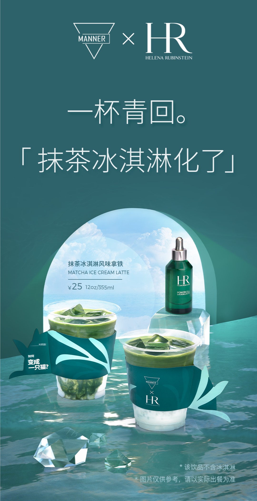 6月份,咖啡品牌MANNER宣布和顶级奢华美容品牌HR赫莲娜绿宝瓶联名,推出联名饮品「一杯青回」。用绿色限定包装点题「加持自愈力量,拥抱困惑,一夜青回」,将目标定位年轻一代的消费者。
