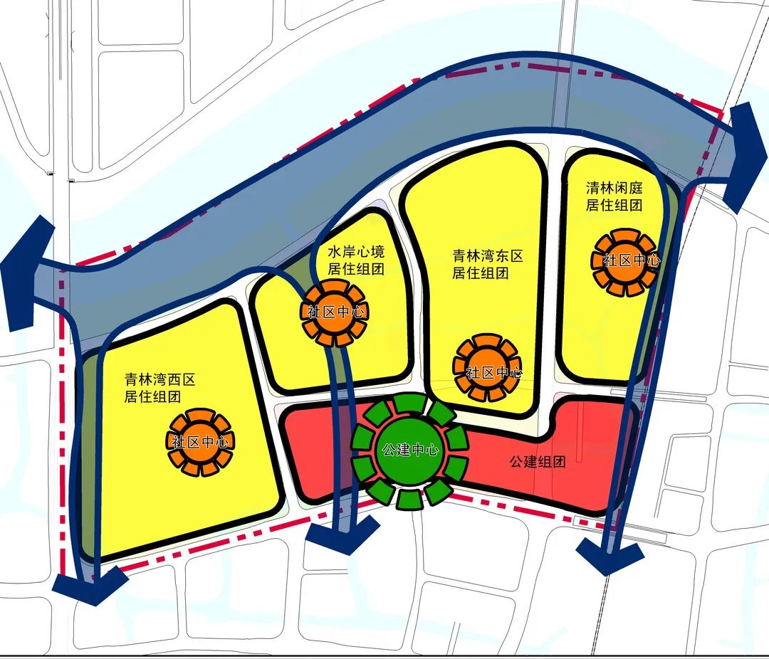 规划形成“北绿、中居、南服务”的总体格局,北区主要为滨江生活休闲区,中部主要以青林湾西区、东区、清林闲庭等小区为主的居住区,南区形成以教育、商业商务为主的公共服务片区。