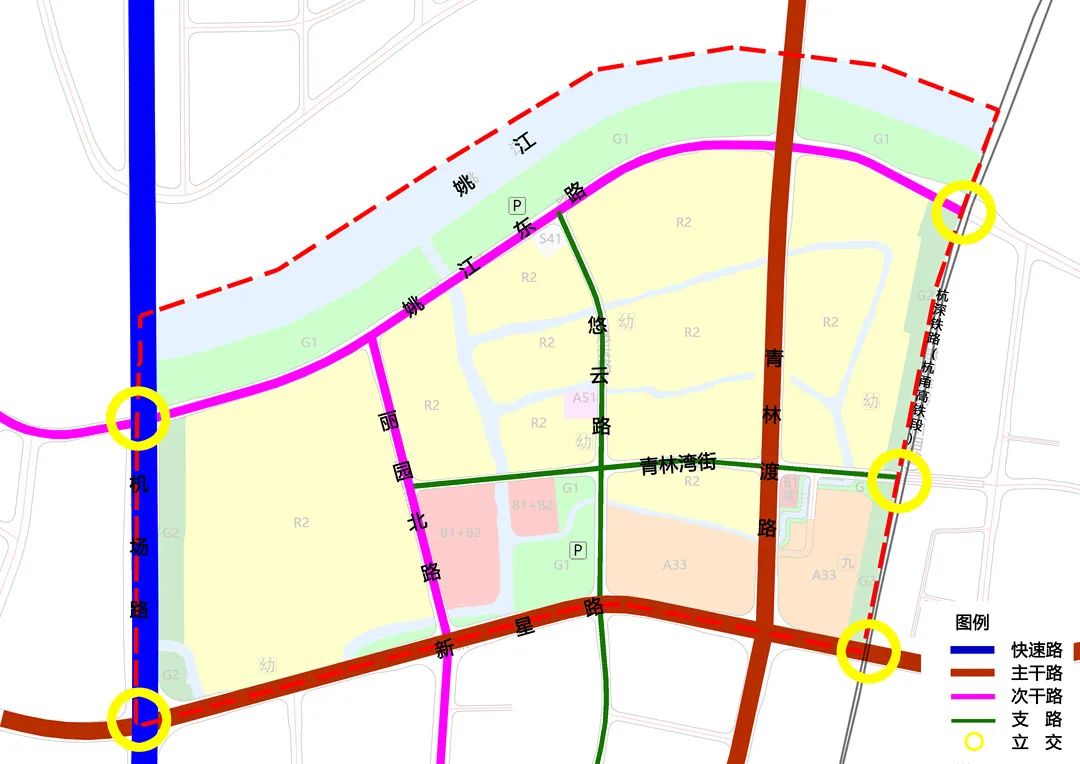 规划区形成“两横三纵”的干路网格局。两横为姚江东路和新星路;三纵为机场路、丽园路和青林渡路。