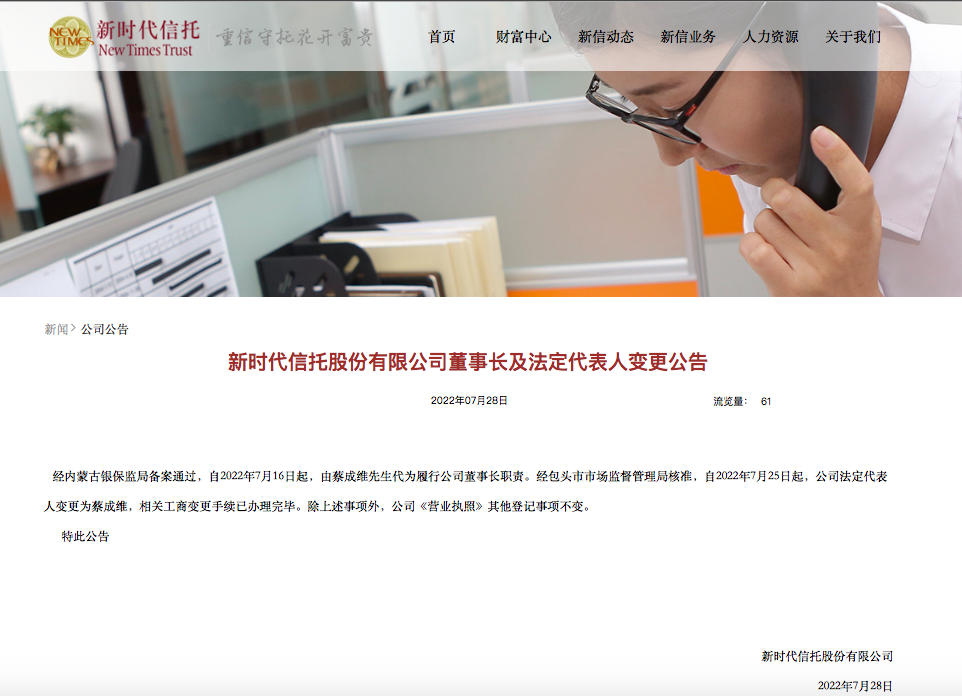 7月28日,新时代信托股份有限公司(下称新时代信托)发布公告称,董事长及法定代表人变更为蔡成维。