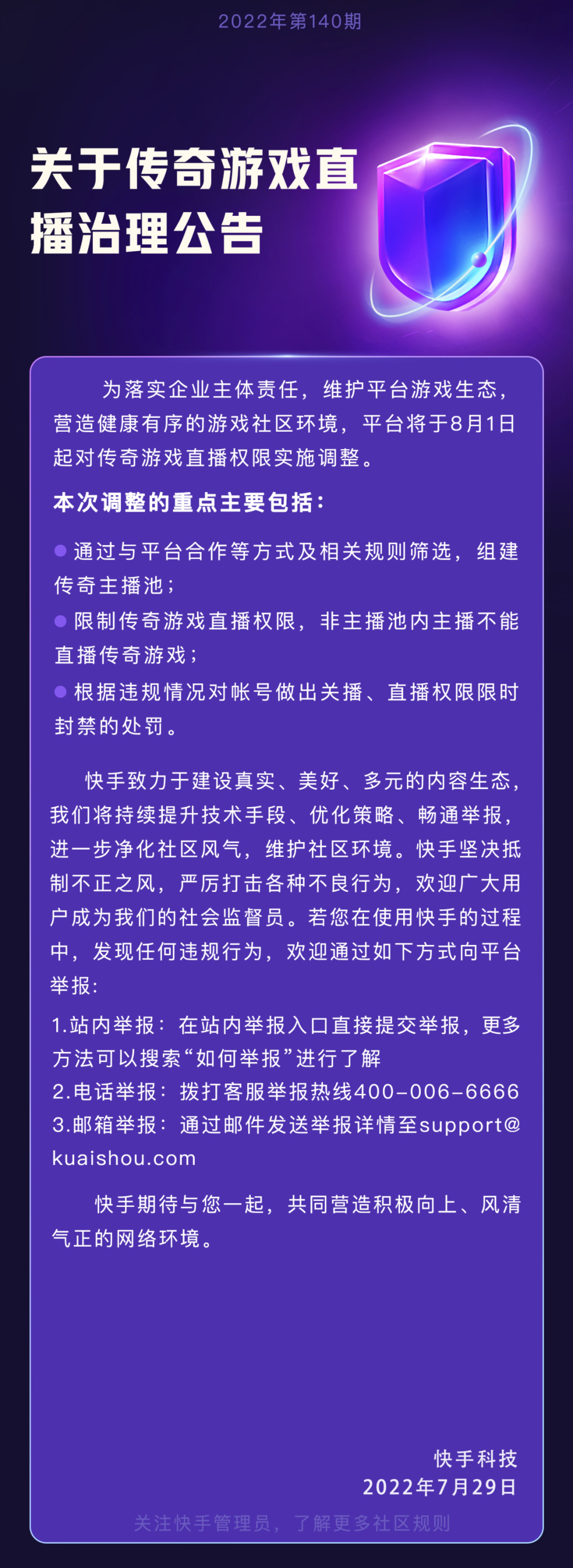 7月29日,快手科技发布公告称,平台将于8月1日起对传奇游戏直播权限实施调整,重点主要包括:通过与平台合作等方式及相关规则筛选,组建传奇主播池;限制传奇游戏直播权限,非主播池内主播不能直播传奇游戏;根据违规情况对帐号做出关播、直播权限限时封禁的处罚。