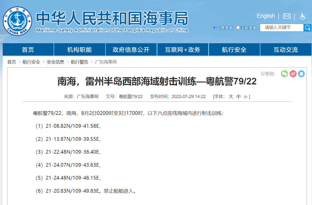 海事局网站消息,7月29日,广东海事局发布航行警告,南海8月2日2时至3日17时,部分海域进行射击训练,禁止船舶进入。