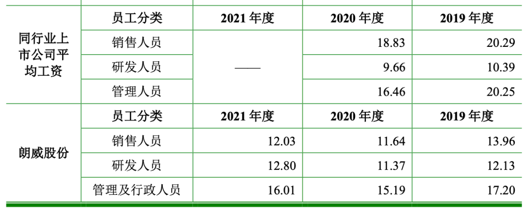 与同行业上市公司的平均水平相比,在劳务外包占比较高的2019年,朗威股份的销售、管理及行政人员工资要远低于行业平均水平,但研发人员的工资略高于行业平均工资。