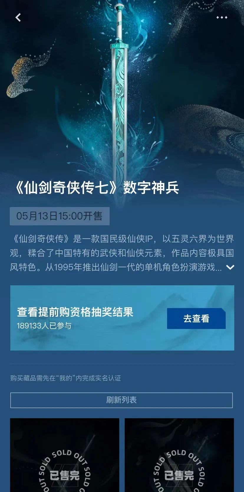 而在更早些时候,“湖南省博物馆-长沙窑数字藏品”,13万人参与提前购资格抽奖。3月29日开售的“洛阳龙门数字石刻藏品”,有11万人参与提前购资格抽奖,且藏品均在当日售罄。而一些国民IP的数字藏品则对比更加明显,如《仙剑奇侠传七》数字神兵系列,有18万人参提前购资格抽奖。