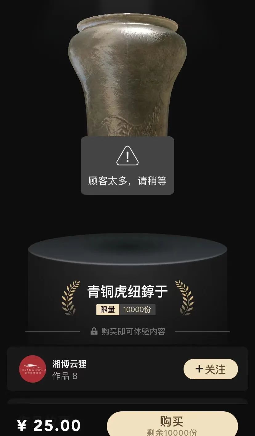 情况也没有特别糟糕,文物类IP仍然显现出相应潜力。娱乐独角兽观察到,数字藏品平台鲸探于今日(7月29日)中午12点开售的“湘博・青铜虎纽錞于”和“湘博・二十五弦瑟”数字藏品,二者各限量一万份,并均在不到一分钟的时间里售罄,评论区有买家抱怨没抢到。