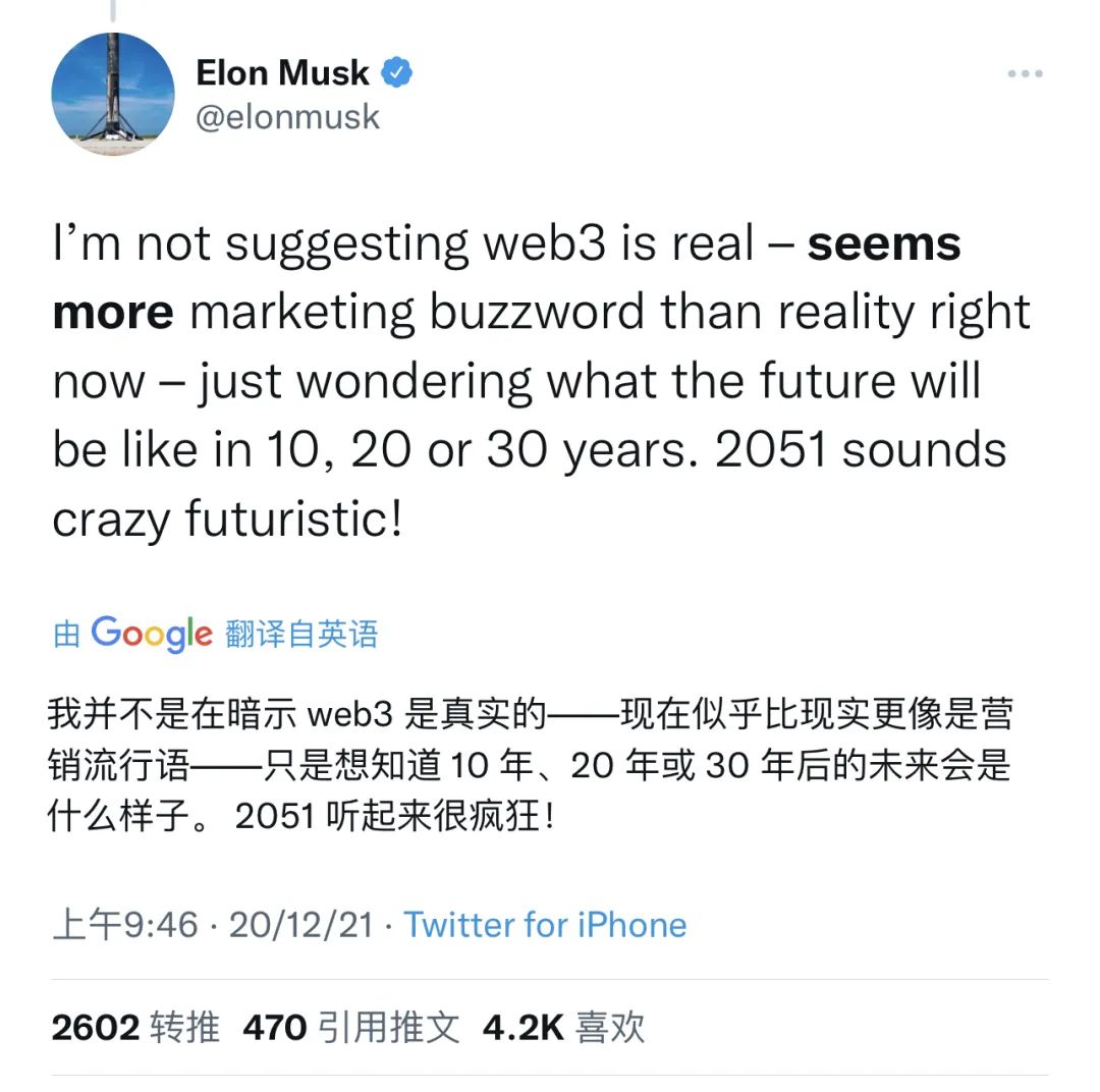 特斯拉CEO马斯克便曾连发多条推特来表达他对互联网未来以及Web3的困惑,他更表示:“(Web3.0)不是真实的,更像是营销术语。”
