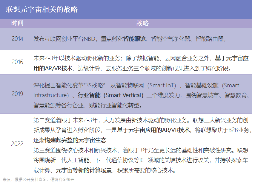 2022年,联想誓师大会上,关于元宇宙的构想又被提起:杨元庆表示,第二赛道着眼于未来2-3年,大力发展由新技术驱动的孵化业务,其中,基于元宇宙应用的AR/VR技术,联想将聚焦于B2B业务,逐渐构建起完整的元宇宙生态。第三赛道围绕核心技术和新兴技术,着眼于3年乃至更长远的基础性和突破性研究,其中也包括元宇宙等新的计算场景,将重点积累核心技术。